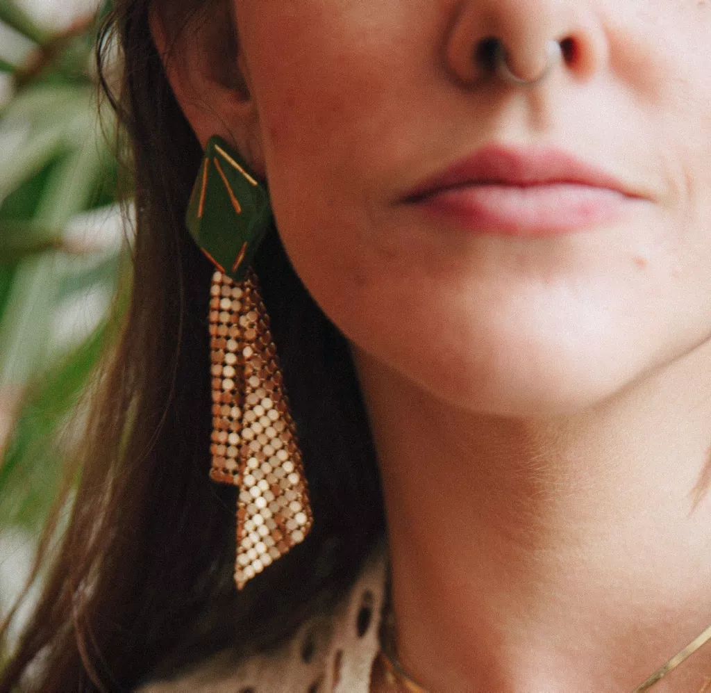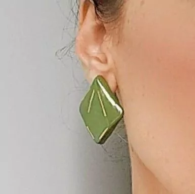 Brinco Esmeralda - cerâmica esmaltada com detalhes pintados em ouro. Produzida e esmaltado à mão. Moldada de forma orgânica.